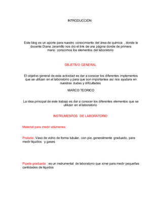 Este documento describe los diferentes elementos y materiales utilizados en un laboratorio de química, incluyendo instrumentos para medir volúmenes, matraces, material general, material para pesar, material para calentar, refrigerantes, soportes, embudos y material de seguridad. El objetivo es dar a conocer los diferentes implementos que se utilizan en el laboratorio y su importancia.