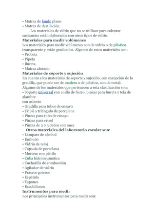 El documento describe los elementos y características fundamentales de un laboratorio de biología y química. Explica que un laboratorio debe estar bien equipado con instrumentos y materiales como matraces, tubos de ensayo, balanzas y mecheros para realizar experimentos de manera segura. También debe contar con procedimientos adecuados de limpieza y métodos para atender accidentes.