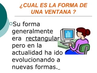 El documento describe los componentes principales de una ventana de Windows. Estos incluyen la barra de título, botones de control, barra de menú, barra de herramientas, barra de dirección, barra de vínculos, área de contenido, barra de desplazamiento y barra de estado. Cada uno de estos componentes tiene una función específica como permitir mover la ventana, cerrarla, acceder a páginas web o desplazarse por el contenido.