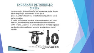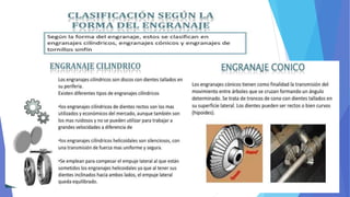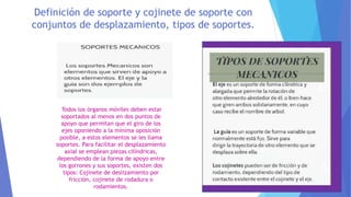 El documento describe diferentes tipos de rodamientos y cojinetes, incluyendo sus definiciones, características y usos. Explica que los rodamientos permiten el movimiento rotativo u oscilatorio mediante bolas o rodillos que separan los anillos interno y externo. También describe engranajes y su función de transmitir movimiento entre ejes a través de dientes acoplados.