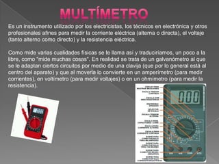 Este documento contiene información sobre conceptos básicos de electricidad como el multímetro, corriente alterna, corriente continua, voltaje alterno, tensión continua, resistencia eléctrica, electrónica y conexión a tierra. Explica que un multímetro mide corriente, voltaje y resistencia eléctrica y cómo funciona. También define corriente alterna, corriente continua, voltaje alterno y tensión continua.