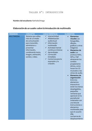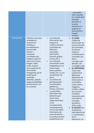 El documento presenta una introducción a los conceptos de multimedia, hipermedia e hipertexto. Define multimedia como un sistema que utiliza más de un medio de comunicación para transmitir información combinando elementos como texto, imágenes, sonido y video. Explica que la hipermedia designa al conjunto de métodos para componer contenidos integrados que permitan la interacción con los usuarios, y que el hipertexto es el nombre dado al texto electrónico que conduce a otro texto relacionado a través de enlaces.