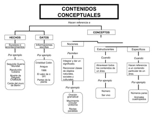 Este documento presenta los elementos fundamentales de la planificación didáctica, incluyendo el diagnóstico, la evaluación, los contenidos (conceptuales, procedimentales y actitudinales), los ejes transversales, y los tipos de evaluación. Se explican conceptos como los contenidos estructurantes y específicos, así como los procesos de aprendizaje significativo, interiorización y diferenciación progresiva. También se describen los componentes del plan de trabajo y la relación entre contenidos y capacidades cognitivas, psicomotrices y afectivas