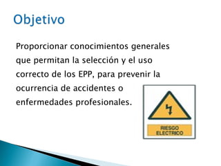 El documento describe los elementos de protección personal (EPP), que son dispositivos diseñados para proteger el cuerpo de los trabajadores de diferentes riesgos en el lugar de trabajo y prevenir accidentes o enfermedades laborales. Los empleadores están obligados a proporcionar EPP gratuitos a los trabajadores según los riesgos del trabajo. Algunos ejemplos de EPP mencionados son cascos, monogafas, guantes y botas dieléctricas para proteger la cabeza, ojos, manos y pies respectivamente.