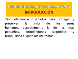 El documento presenta un proyecto escolar sobre elementos de protección eléctrica. Pide realizar un informe detallado respondiendo preguntas sobre qué son, por qué son necesarios y qué tipos existen. Además, solicita listar los elementos necesarios para viviendas y un taller escolar. El trabajo debe realizarse en grupos utilizando recursos como libros, sitios web y será evaluado por su desarrollo y capacidad de síntesis.