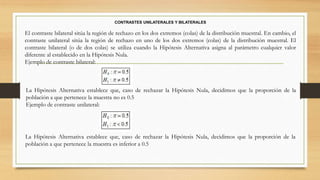1) El documento describe los elementos de pruebas de hipótesis unilaterales y bilaterales. Un contraste bilateral sitúa la región de rechazo en ambos extremos de la distribución muestral, mientras que un contraste unilateral solo sitúa la región de rechazo en uno de los extremos.