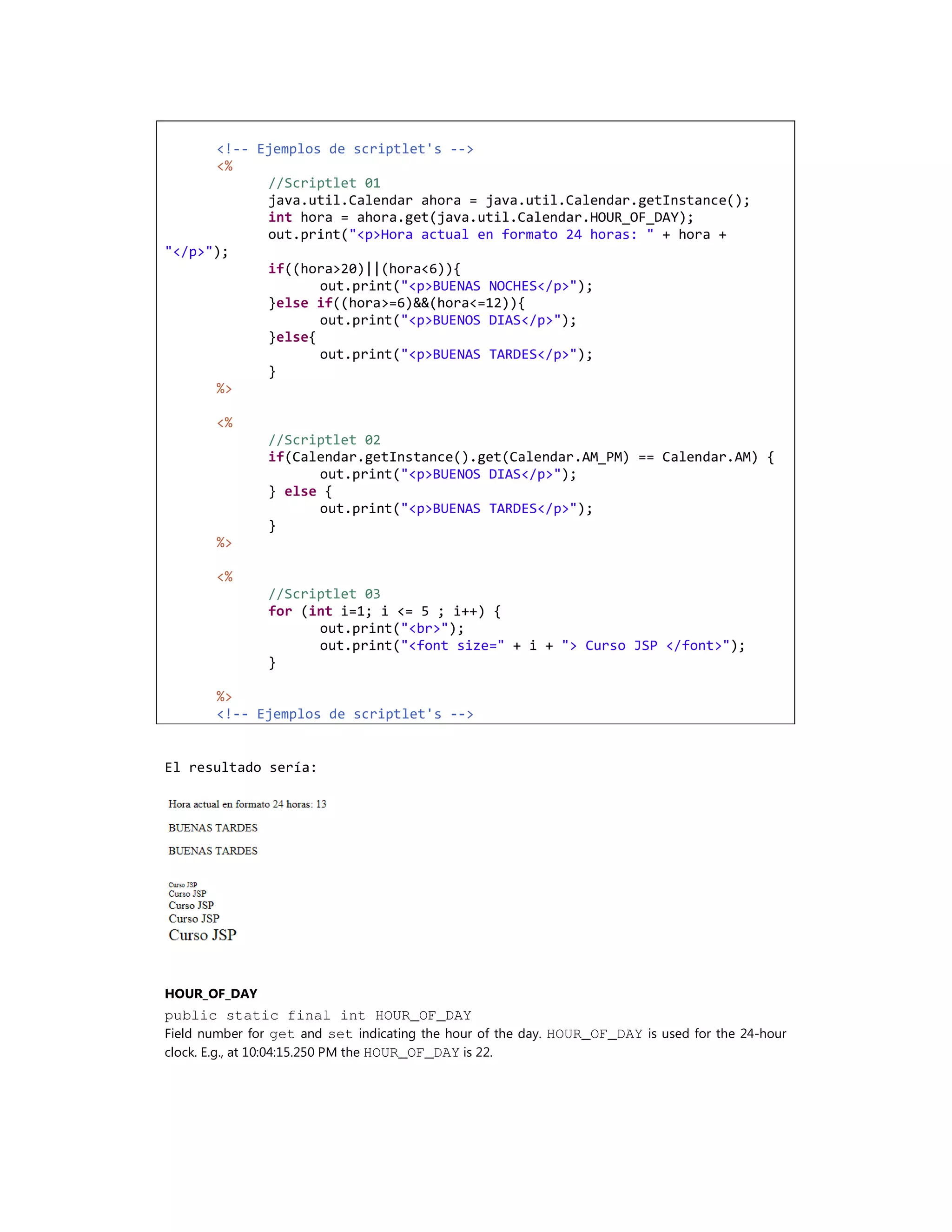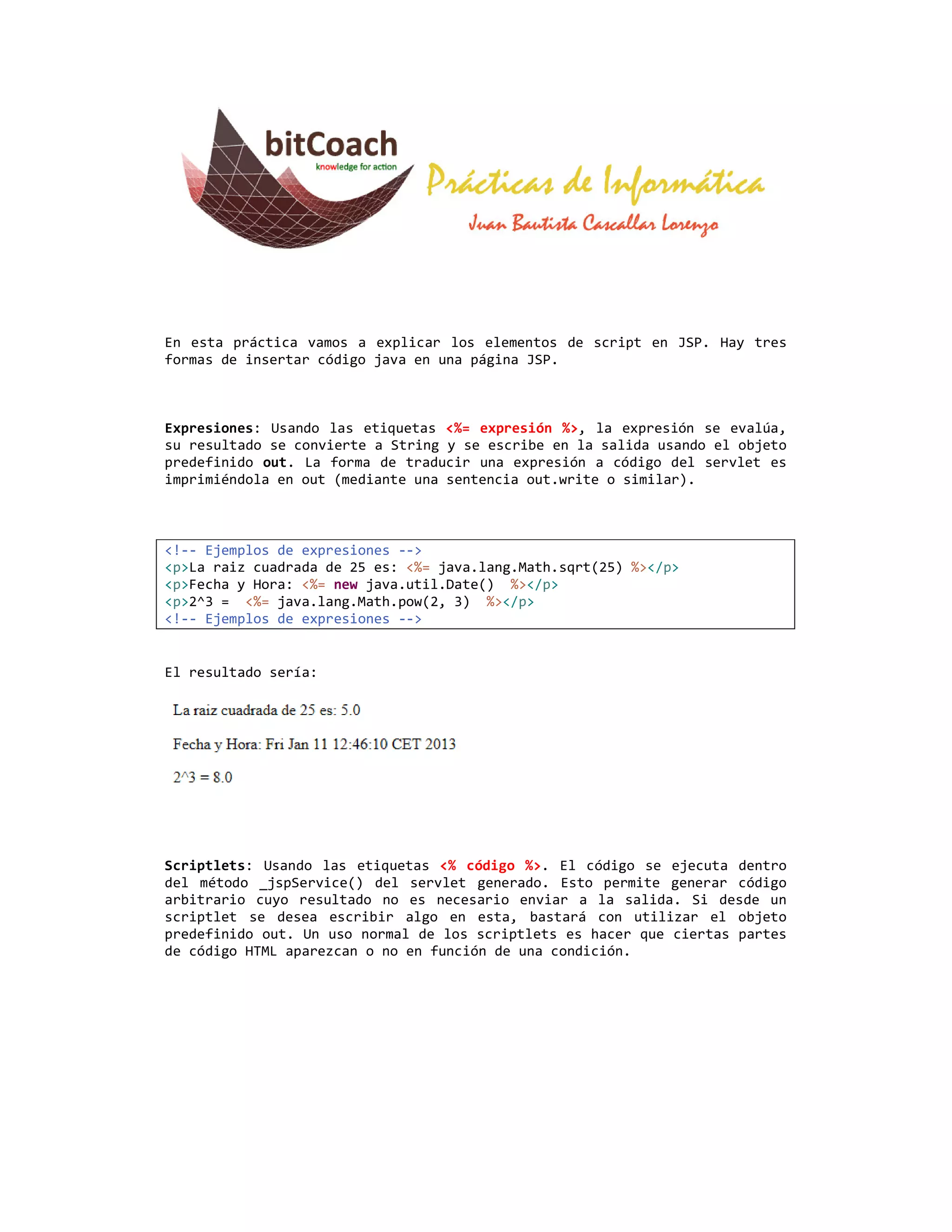 Este documento explica los tres métodos para insertar código Java en una página JSP: expresiones, scriptlets y declaraciones. Las expresiones evalúan código Java y escriben el resultado, los scriptlets ejecutan código arbitrario y pueden escribir en la salida, y las declaraciones definen variables fuera de los métodos del servlet generado.