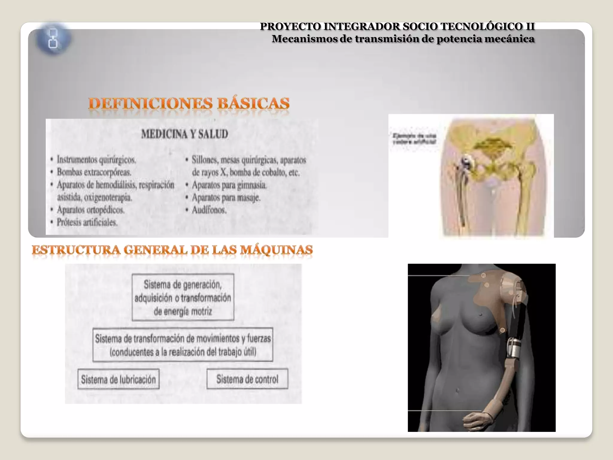 El documento describe diferentes mecanismos de transmisión de potencia mecánica como engranajes, correas, cadenas, levas, acoplamientos y sus características. Explica conceptos como máquina, mecanismo, elemento, carga, junta, restricción y diferentes tipos de pares cinemáticos. También analiza fallas comunes y cómo determinar la longitud de correas.