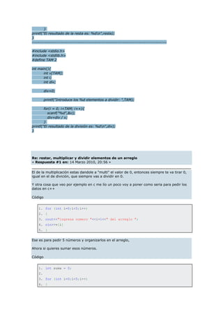 Este documento contiene código para sumar los elementos de un array utilizando un bucle for en C. Explica que la variable suma se inicializa en 0 y luego en cada iteración del bucle se le suma el elemento correspondiente del array, de modo que al finalizar el bucle suma tendrá el total de todos los elementos del array. También menciona la importancia de conocer el valor de n para que el bucle se ejecute correctamente.
