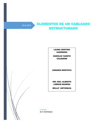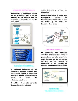 El documento describe los elementos fundamentales de un cableado estructurado, incluyendo el cableado horizontal y vertical, armarios de telecomunicaciones, cuartos de equipos, y varios accesorios como canaletas, racks, patch panels y herramientas. Explica los propósitos y requisitos de cada componente para implementar una red de área local dentro de un edificio.
