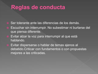 Este documento proporciona instrucciones para organizar y moderar un debate efectivo. Recomienda elegir un tema interesante, formar grupos a favor y en contra, y preparar materiales de apoyo. También sugiere que el moderador introduzca el tema, intervenga si alguien levanta la voz, y describa las conclusiones.