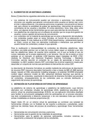 El documento revisa la evolución y características de las plataformas de e-learning, destacando su integración de tecnologías y métodos de enseñanza a distancia. Se analizan elementos clave como la interactividad, la flexibilidad y los sistemas de gestión de contenidos en la educación en línea. Además, se presentan ejemplos de plataformas populares como Moodle y Dokeos, evidenciando sus funcionalidades y adaptabilidad en el proceso educativo.