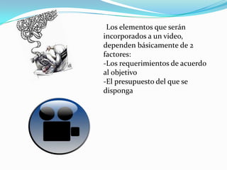 El documento describe los diferentes elementos que pueden incluirse en un video, dependiendo del objetivo y el presupuesto. Estos elementos incluyen un guión, imágenes grabadas, animaciones, gráficos, texto, traducción/subtitulaje, locución, conductores frente a cámara, locaciones especiales, recursos técnicos especializados y musicalización. Cada elemento cumple un propósito específico para transmitir efectivamente el mensaje del video.