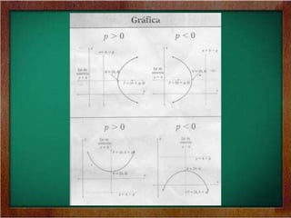 El documento explica cómo determinar los elementos clave de una parábola como el vértice, foco, directriz, eje de simetría y longitud del lado recto a partir de su ecuación o gráfica. Proporciona un ejemplo de cómo calcular estos elementos para una parábola horizontal dada por la ecuación (y+1)^2 = 6(x-5). También presenta la ecuación general de una parábola y ejemplos de parábolas horizontales y verticales.