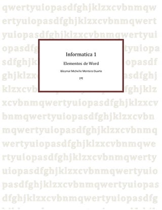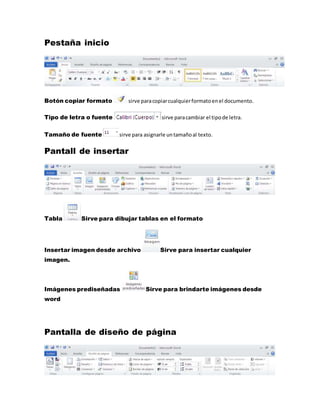 Este documento describe los diferentes elementos de la interfaz de usuario de Microsoft Word, incluyendo las pestañas de inicio, insertar, diseño de página, referencias, correspondencia y vista. Explica las funciones de elementos como copiar formato, tablas, imágenes, temas, márgenes, orientación de página, tabla de contenido y más.