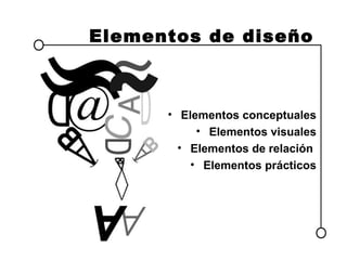 Este documento describe los diferentes elementos de diseño divididos en cuatro categorías: elementos conceptuales (punto, línea, plano y volumen), elementos visuales (forma, medida, color y textura), elementos de relación (dirección, posición, espacio y gravedad) y elementos prácticos (representación, significado y función). Los elementos conceptuales no son visibles pero forman la base de los elementos visuales que sí pueden ser vistos. Los elementos de relación gobiernan la ubicación y relación entre formas, mientras que los elementos prácticos se refieren al conten