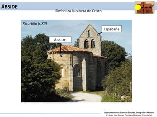 El documento describe las características arquitectónicas de varias iglesias románicas en Cantabria, España, incluyendo detalles sobre el ábside, cimborrio, torre campanario y otros elementos. Explica que el ábside se orienta hacia el este como símbolo de la luz divina y la resurrección, y que simboliza la cabeza de Cristo.