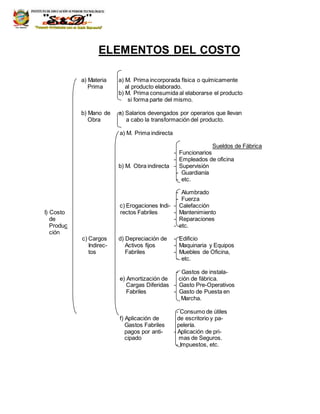 El documento clasifica y define los diferentes tipos de costos involucrados en la producción y distribución de productos. Identifica los costos primarios, de conversión, variables, fijos, directos e indirectos. Explica que los costos primarios incluyen materia prima y mano de obra directa, mientras que los costos de conversión incluyen mano de obra y gastos de fabricación. También distingue entre costos variables, que cambian con el volumen de producción u operaciones, y costos fijos, que permanecen constantes independientemente del volumen.