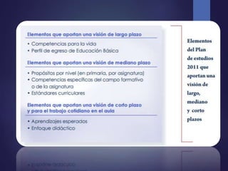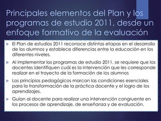 El documento resume los principales elementos del Plan y los programas de estudio 2011 desde una perspectiva de evaluación formativa. Reconoce etapas en el desarrollo de los estudiantes y establece diferencias entre niveles educativos. Guía al profesorado a realizar una intervención congruente en los procesos de enseñanza, aprendizaje y evaluación centrándose en los estudiantes y atendiendo a la diversidad. Los aprendizajes esperados son el referente para la evaluación formativa en las distintas etapas de la secuencia didá