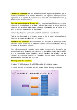 Este documento describe los diferentes elementos que componen el currículo educativo ecuatoriano. Define los aprendizajes básicos como aquellos necesarios para el desarrollo personal y la ciudadanía, y los clasifica en imprescindibles, deseables y por subnivel educativo. También describe los bloques curriculares, criterios de evaluación, destrezas, indicadores, niveles educativos y objetivos generales, integradores y de área por subnivel, entre otros componentes. El objetivo final es asegurar un desarrollo integral de los estudiantes al con