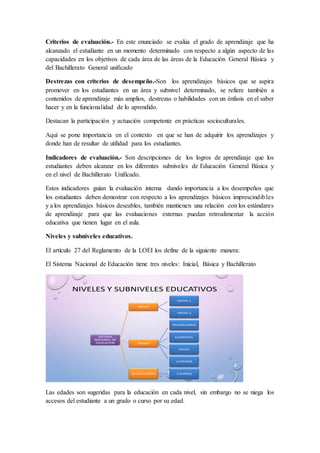 Este documento describe los diferentes elementos que componen el currículo educativo en Ecuador. Define los aprendizajes básicos, divididos en imprescindibles, deseables y básicos, así como los bloques curriculares, criterios de evaluación, destrezas, indicadores, niveles y subniveles educativos, objetivos generales y de área, y el perfil de bachillerato ecuatoriano.