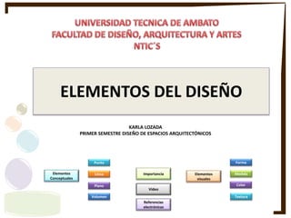 El documento detalla los elementos esenciales del diseño arquitectónico, incluyendo conceptos como punto, línea, plano y volumen, que son fundamentales para crear estructuras. También aborda los elementos visuales, como forma, medida, color y textura, que son cruciales para la percepción y satisfacción de las necesidades del usuario en el diseño. Se enfatiza la importancia de estos elementos en la práctica del diseño, diferenciándolo de otras formas de arte como la pintura y la escultura.