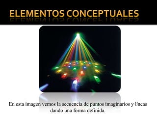 Este documento describe los diferentes elementos del diseño, incluyendo elementos conceptuales, visuales, de relación y prácticos. Los elementos conceptuales incluyen líneas, planos y volúmenes que crean movimiento y forma. Los elementos visuales materializan los conceptos a través de formas, tamaños, colores y texturas. Los elementos de relación se refieren a cómo las imágenes pueden ubicarse en diferentes posiciones y significados. Los elementos prácticos incluyen la representación, el significado y la fusión de varios elementos en un diseño.