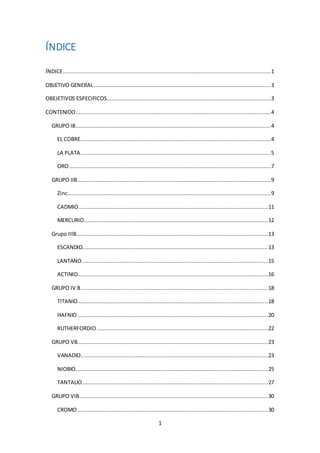 Este documento presenta información sobre varios elementos del grupo B de la tabla periódica. Describe las propiedades y usos del cobre, la plata y el oro. También cubre otros elementos como el zinc, cadmio, mercurio, titanio, vanadio y molibdeno. El documento incluye detalles sobre las características químicas y físicas de estos elementos, así como sus aplicaciones principales.