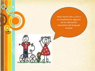 Este documento introduce tres elementos fundamentales del lenguaje musical: la intensidad, la velocidad y el timbre. La intensidad se refiere al volumen de un sonido, ya sea fuerte o suave. La velocidad se refiere a qué tan rápido o lento es un sonido. El timbre se refiere al carácter distintivo de un sonido producido por un instrumento o voz.