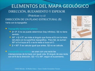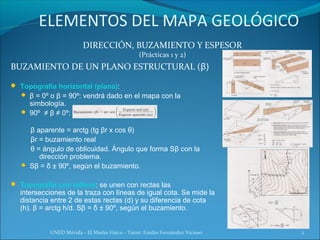 Este documento describe los elementos fundamentales para representar la dirección, el buzamiento y el espesor de las capas geológicas en un mapa geológico. Explica cómo calcular la dirección y el buzamiento en topografías planas y con relieve, así como el método de las horizontales para determinar la traza de una estructura a partir de un punto. También resume los pasos para determinar la dirección, el buzamiento y la traza mediante las cotas de afloramiento en 3 puntos.