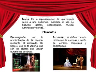 El teatro es una representación de historias ante una audiencia, utilizando elementos como escenografía, actuación, dirección e iluminación. La escenografía ambienta la escena, mientras que el vestuario y maquillaje caracterizan a los personajes. Además, el sonido y la coreografía complementan la experiencia teatral a través de movimientos y música.