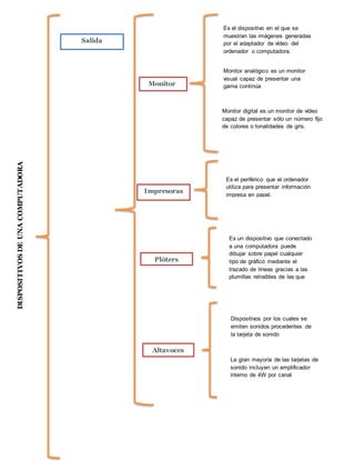 El documento describe los principales dispositivos de entrada y salida de una computadora. Entre los dispositivos de salida menciona monitores analógicos y digitales, impresoras, ploteadores y altavoces. Como dispositivos de entrada describe teclados, mouse, ratones de diferentes tipos (mecánicos, opto-mecánicos, de rueda y ópticos) y escáneres de dos tipos (flatbed y de mano). Explica brevemente las funciones de cada dispositivo.