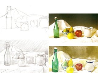 El documento describe los elementos expresivos de la línea, el punto y el plano en el arte. Explica cómo estas formas básicas pueden usarse para crear composiciones y transmitir significado. También proporciona ejemplos de obras de arte famosas que ilustran el uso efectivo de estos elementos.