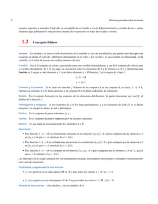 Este documento presenta nociones generales sobre funciones. Define una función como una relación entre dos cantidades donde una depende de la otra. Explica conceptos básicos como variable, dominio, codominio, gráfico e intervalos de monotonía. Describe diferentes tipos de funciones como lineales, cuadráticas y radicales. Finalmente, cubre temas como operaciones con funciones, funciones inversas y composición de funciones.