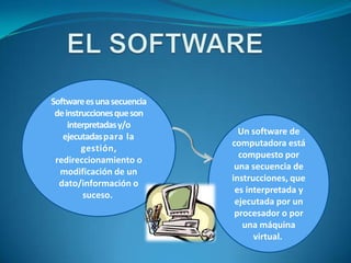 Este documento describe la diferencia entre software y hardware de computadoras. Explica que el software son secuencias de instrucciones interpretadas por el hardware para gestionar datos e información, mientras que el hardware son las partes físicas y tangibles como gabinetes, cables, tarjetas de video y periféricos. Además, clasifica el software en de sistema, que controla la computadora, y de aplicaciones, que son los programas utilizados por los usuarios para realizar tareas.