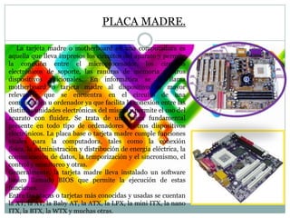 Este documento describe los principales componentes de una computadora, incluyendo la placa madre, el microprocesador, la memoria RAM, el disco duro, la fuente de alimentación, el software y el hardware. También describe periféricos como la unidad CD-ROM y dispositivos de entrada/salida.