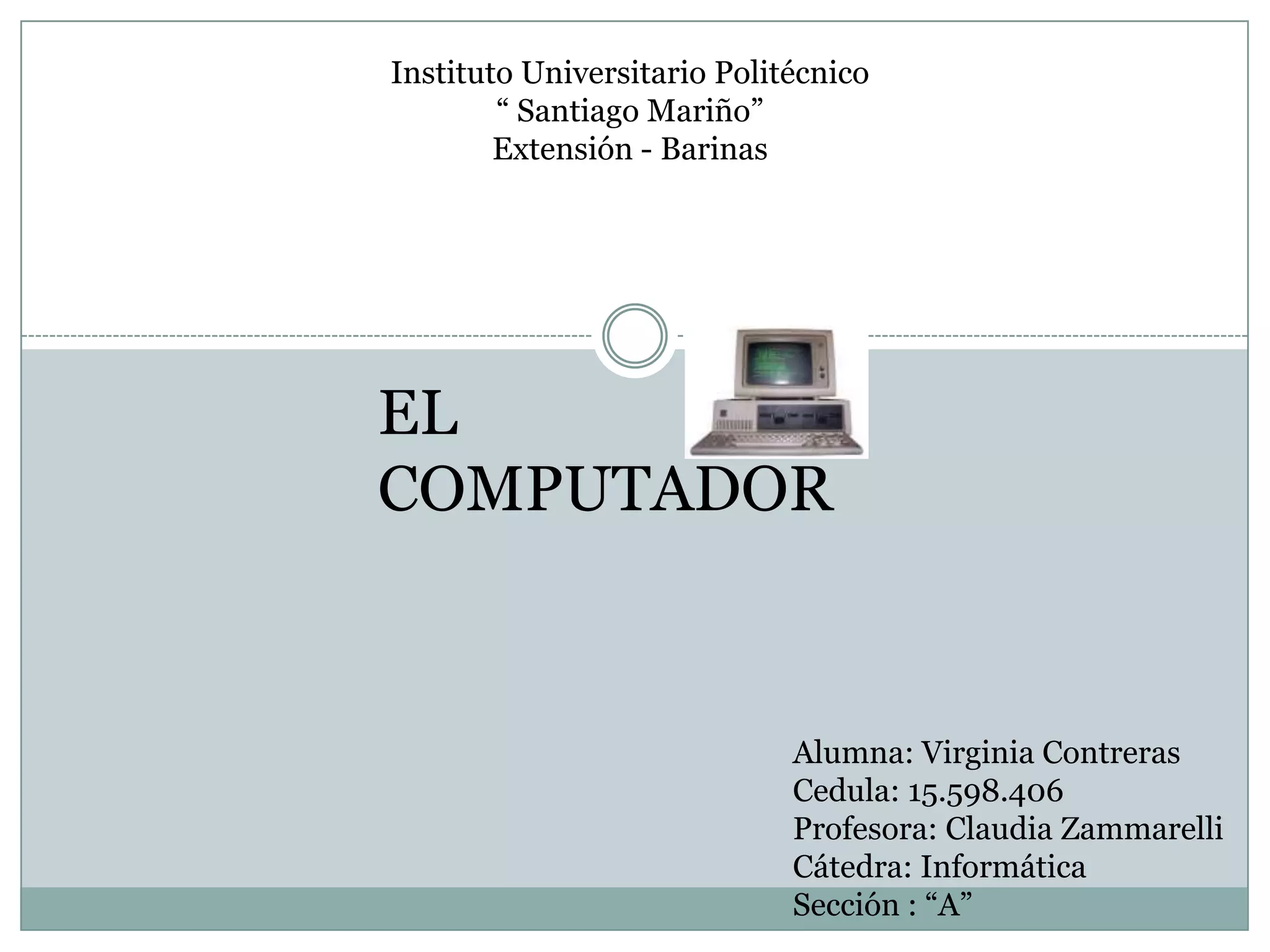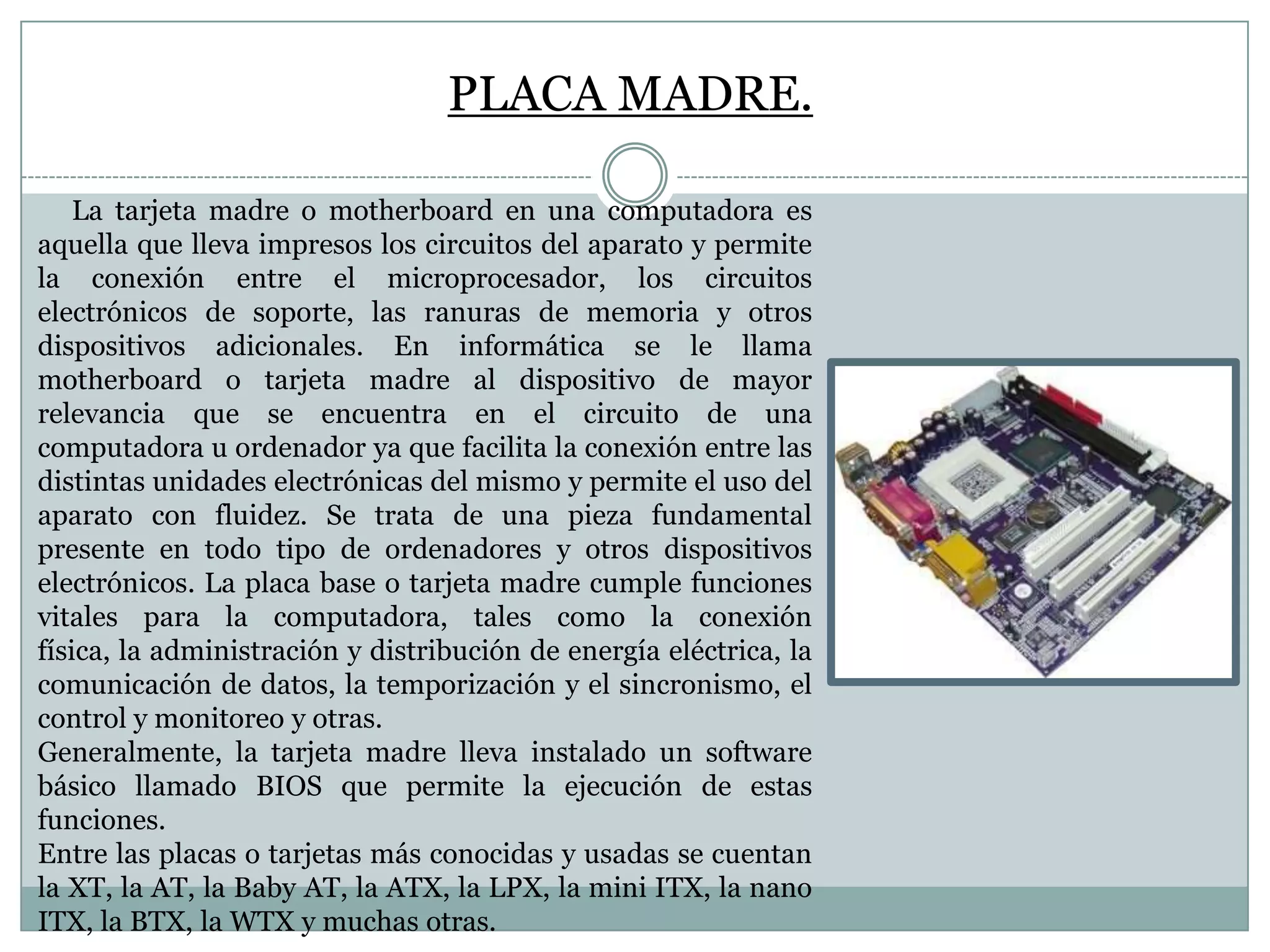 El documento describe los principales componentes de una computadora, incluyendo la placa madre, el microprocesador, la memoria RAM, el disco duro, la fuente de alimentación, el software, el hardware, la unidad CD-ROM, los periféricos, la fuente de poder, los registros y los buses internos. Explica brevemente la función de cada uno de estos componentes clave en el funcionamiento de una computadora.