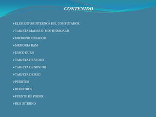 Este documento describe los principales componentes internos de una computadora, incluyendo la tarjeta madre, el microprocesador, la memoria RAM, el disco duro, las tarjetas de video y de sonido, los puertos, los registros, la fuente de poder y el bus interno. Cada componente juega un papel clave en el funcionamiento general de la computadora al procesar y almacenar información o facilitar la comunicación con dispositivos externos.