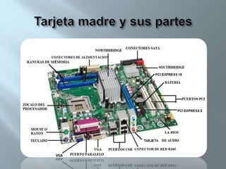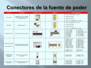 El documento describe los principales componentes de una computadora, incluyendo la fuente de alimentación, la tarjeta madre, la unidad central de procesamiento (CPU), el disco duro, la memoria RAM y la unidad óptica. Cada uno de estos componentes cumple una función específica para el funcionamiento general del sistema.