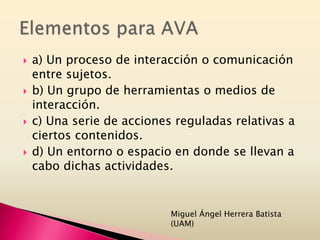El documento describe los elementos clave de la planeación didáctica para cursos virtuales. Explica que la planeación debe incluir un programa del curso con los contenidos y calendario de actividades, vías de comunicación y retroalimentación, espacios para intercambio de ideas, y centros de recursos. También discute factores como medios de interacción, recursos, diseño instruccional y diseño de interfaz que son importantes considerar para el aprendizaje virtual.