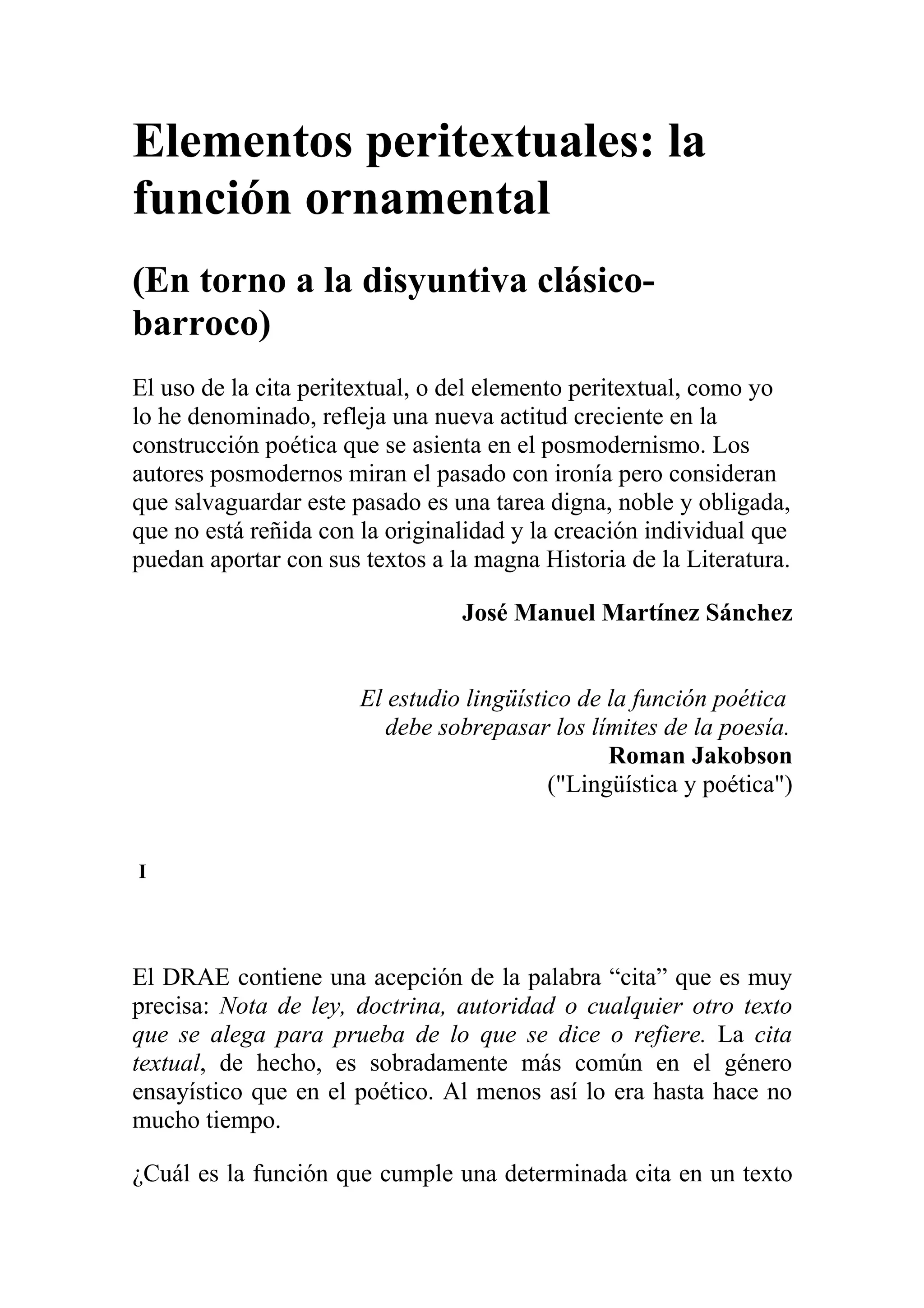 El documento analiza la función y el uso de los elementos peritextuales en la poesía posmoderna, destacando su papel tanto ornamental como estructural. Se argumenta que estos elementos, aunque no son exclusivos de la actualidad, reflejan una relación de dependencia entre la cita y el texto poético, sugiriendo una actitud que entrelaza la originalidad con la tradición. Asimismo, se establece una distinción entre peritextualidad e intertextualidad, enfatizando que el peritexto puede contribuir a la construcción narrativa de manera significativa.