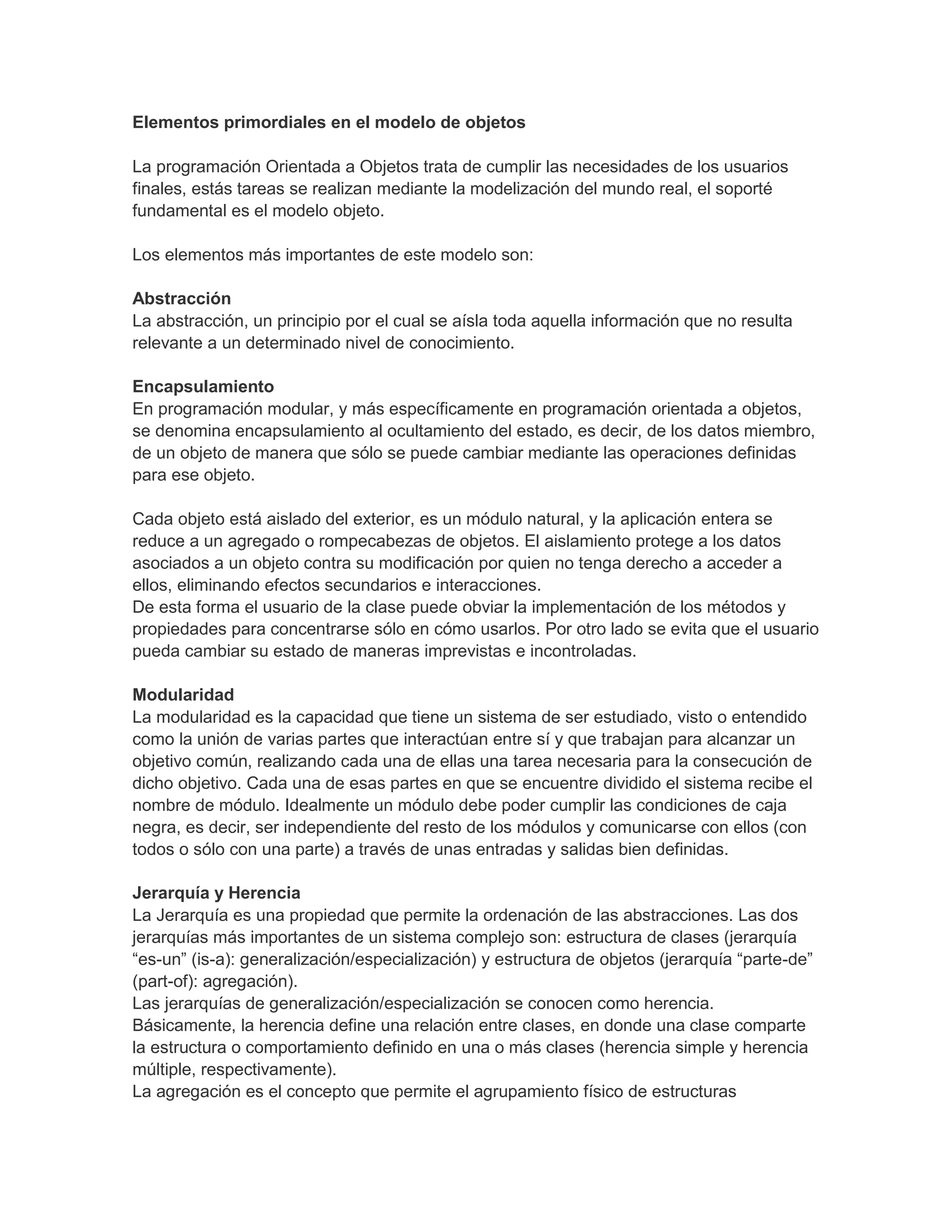 Los elementos fundamentales del modelo de objetos son la abstracción, el encapsulamiento y la modularidad. La abstracción oculta información irrelevante, el encapsulamiento oculta el estado interno de un objeto y la modularidad permite dividir un sistema en partes interconectadas. Otros elementos importantes son la jerarquía y herencia, que permiten la clasificación de objetos, y el polimorfismo, que permite que objetos de diferentes clases respondan de forma diferente a los mismos mensajes.