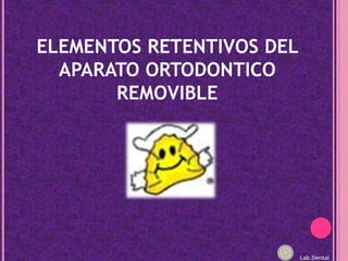 Este documento describe diferentes tipos de ganchos utilizados como elementos retentivos en aparatos ortodónticos removibles, incluyendo el gancho de Adams, gancho gota, gancho abrazadera, gancho Torres y gancho media Torres. Explica los materiales, ubicación y método de fabricación de cada gancho con ilustraciones.