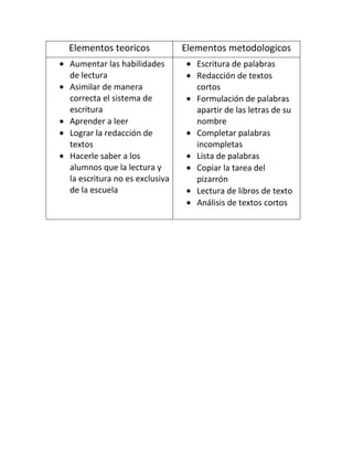 Este documento describe elementos teóricos y metodológicos para mejorar las habilidades de lectura y escritura en los estudiantes. Los elementos teóricos incluyen aumentar las habilidades de lectura, asimilar correctamente el sistema de escritura y aprender a leer y redactar textos. Los elementos metodológicos son escribir palabras, completar palabras incompletas, copiar tareas del pizarrón y analizar textos cortos.