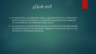 Este documento presenta información sobre varios elementos traza necesarios para el cuerpo humano, incluyendo su símbolo químico, número atómico, descubrimiento y usos. Los elementos discutidos son litio, flúor, silicio, vanadio, boro, cromo, manganeso, hierro y sus funciones en el organismo.