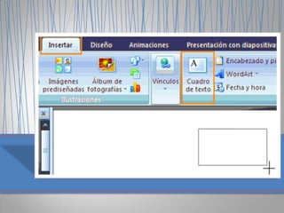Este documento proporciona instrucciones sobre cómo seleccionar e imprimir presentaciones de PowerPoint, editar texto y objetos, y agregar y formatear cuadros de texto, imágenes y gráficos. Incluye pasos para revisar la ortografía, crear y modificar WordArt, y cortar, copiar y pegar diapositivas y objetos entre presentaciones.