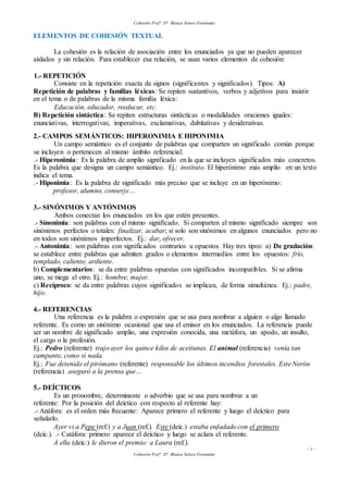 Este documento describe los diferentes elementos de cohesión textual que conectan los enunciados dentro de un texto, incluyendo la repetición, campos semánticos, sinónimos y antónimos, referencias, deícticos, elipsis, y conectores y marcadores del discurso. Algunos de los elementos mencionados son la repetición de palabras, hiperonimia e hiponimia para establecer campos semánticos, sinonimia y antonimia para conectar significados opuestos o iguales, y el uso de conjunciones, locuciones y expres