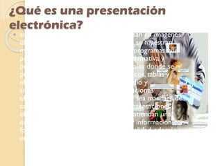 Una presentación electrónica es un documento digital creado en programas como PowerPoint que permite incluir texto, imágenes, videos y animaciones para presentar información de manera atractiva y fácil de comprender. Las presentaciones electrónicas tienen ventajas como facilitar los cambios, mantener la atención del público con efectos visuales y permitir la interacción, aunque también existe el riesgo de abusar de la tecnología. El documento también explica qué son la barra de título, la cinta de opciones y la barra de estado en programas