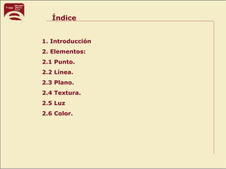 El documento describe los elementos básicos del lenguaje gráfico-plástico: punto, línea, plano, textura, luz y color. Explica que cada elemento tiene características específicas y capacidad expresiva que enriquecen la composición final. Define cada elemento y analiza sus cualidades para comprender la estructura del lenguaje visual.