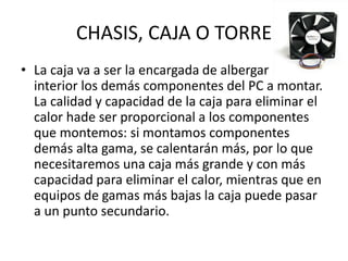 El documento describe los principales componentes de un ordenador, incluyendo la caja, fuente de alimentación, placa base, CPU, disipador, memoria RAM, GPU, disco duro, grabador y sistema operativo. Explica brevemente la función de cada componente y algunas consideraciones al elegirlos.